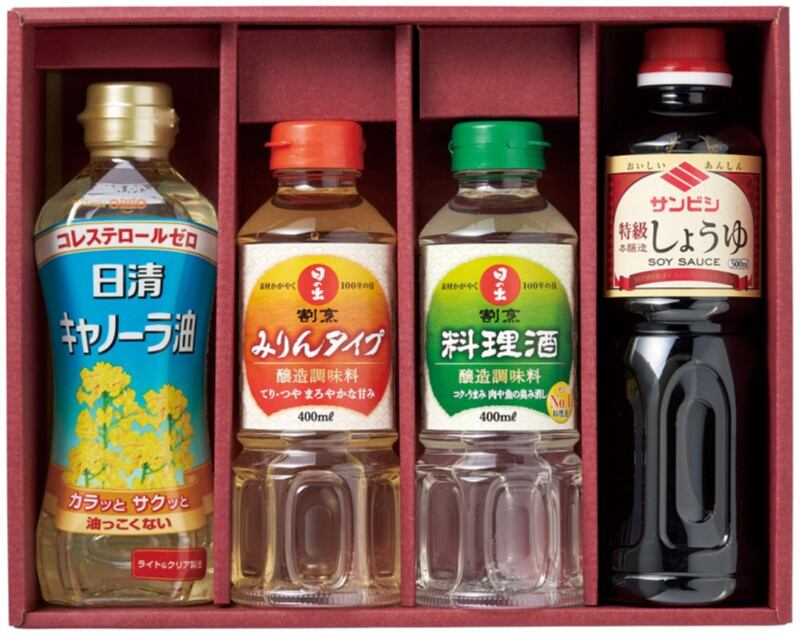 商品内容:日清キャノーラ油350g×1、サンビシ特級本醸造しょうゆ500ml×1、日の出割烹料理酒400ml×1