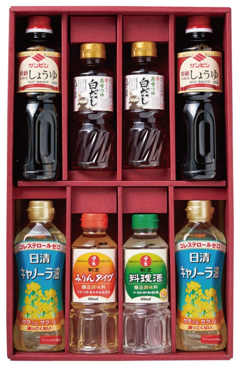 商品内容:日清キャノーラ油350g×2、サンビシ特級本醸造しょうゆ500ml×2、日の出割烹料理酒400ml×1、日の出割烹みりんタイプ400ml×1、ワダカンつゆ白だし300ml×2