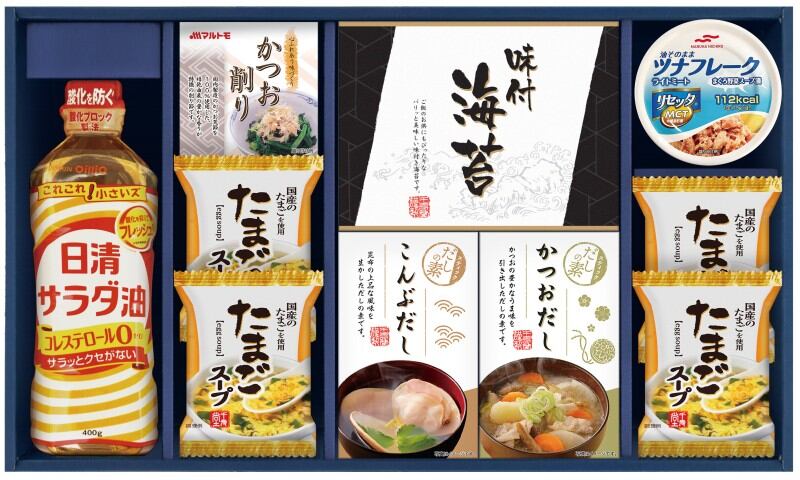 商品内容:日清サラダ油400g、有明海産味のり(8切8枚×2)、かね七かつおだし(4g×5)、かね七こんぶだし(4g×5)、たまごスープ6.4g×4、マルトモかつおパック(0.7g×3袋)、マルハニチロ 油そのままライトツナリセッタ70g
