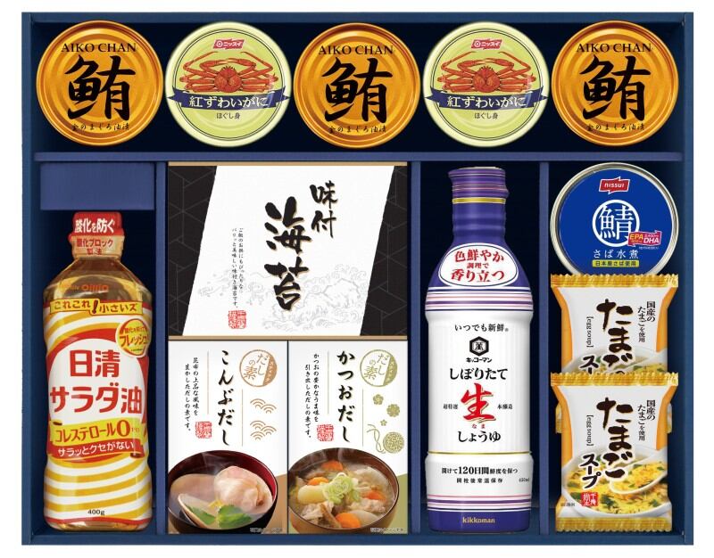 商品内容:日清サラダ油400g、有明海産味のり(8切8枚×2)、かね七かつおだし(4g×5)、かね七こんぶだし(4g×5)、たまごスープ6.4g×2、キッコーマンしぼりたて生しょうゆ450ml、まぐろ油漬け70g×3、ニッスイ紅ずわいがにほぐし身55g×2、ニッスイさば水煮150g