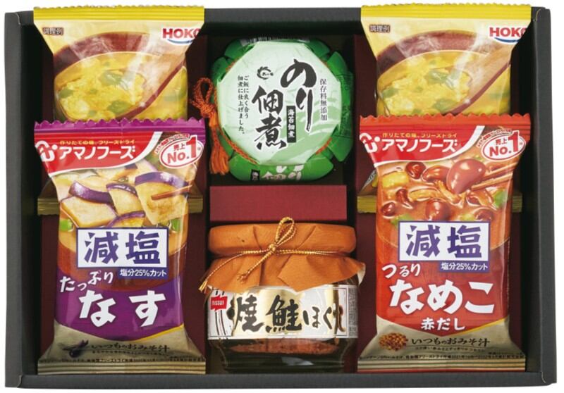 商品内容:アマノフーズ減塩いつものおみそ汁(なす・なめこ)×各1、宝幸 たまごスープ×2、ニッスイ焼鮭ほぐし50g×1、島の香 のり佃煮80g×1