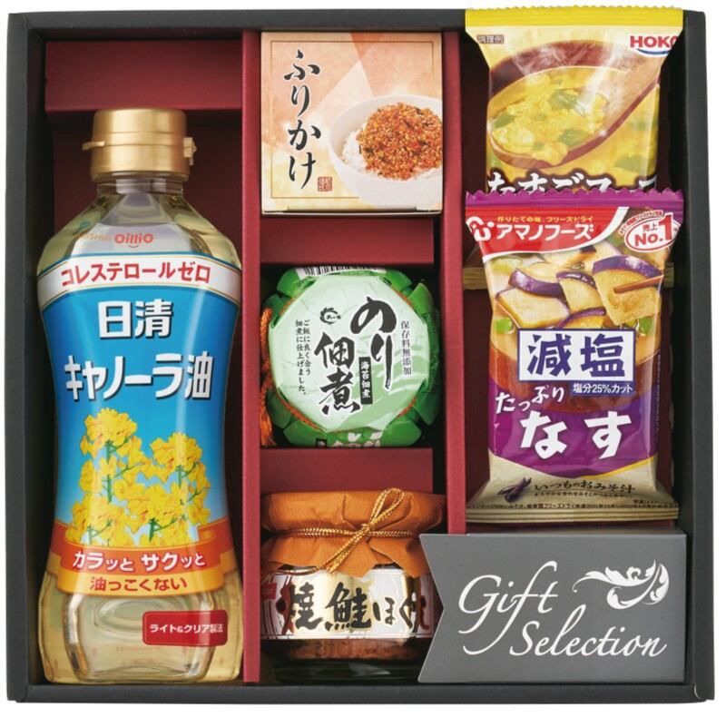 商品内容:日清キャノーラ油350g×1、アマノフーズ減塩いつものおみそ汁(なす)×1、宝幸 たまごスープ×1、ニッスイ焼鮭ほぐし50g×1、島の香 のり佃煮80g×1、丸美屋 さけふりかけ(2入)×1