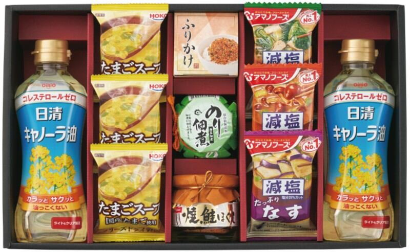 商品内容:日清キャノーラ油350g×2、アマノフーズ減塩いつものおみそ汁(なす・なめこ・ほうれん草)×各1、宝幸 たまごスープ×3、ニッスイ焼鮭ほぐし50g×1、島の香 のり佃煮80g×1、丸美屋 さけふりかけ(2入)×1