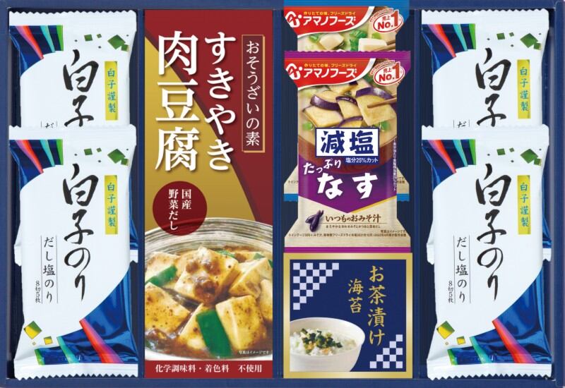 商品内容:白子のりだし塩のり(8切5枚)×4、減塩いつものおみそ汁×2(とうふ10.3g、なす9g 各1)、キッコーマンすきやき肉豆腐140g×1、永谷園お茶づけ海苔(4.7g×2)×1