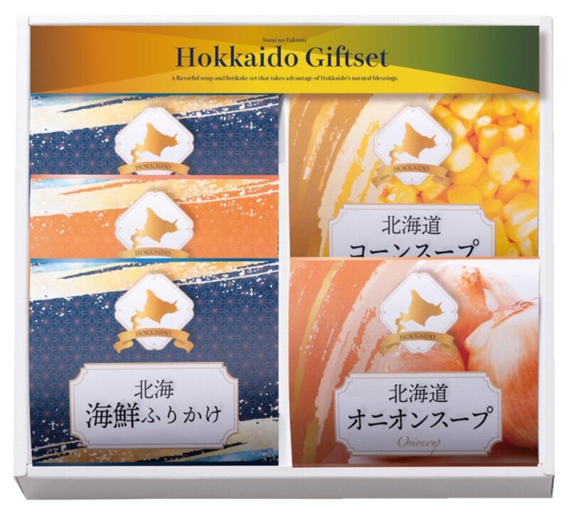 商品内容:北海道産コーンスープ(16.5g)2個入り×1 北海道産オニオンスープ(7g)2個入り×1 北海道産野菜ふりかけ(3g)3個入り×1 北海海鮮ふりかけ(3g)3個入り×2