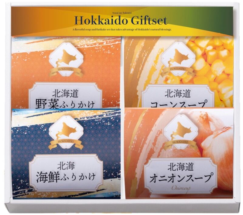商品内容:北海道産コーンスープ(16.5g)2個入り×2 北海道産オニオンスープ(7g)2個入り×2 北海道産野菜ふりかけ(3g)3個入り×2 北海海鮮ふりかけ(3g)3個入り×2