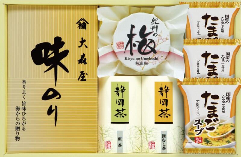 商品内容:大森屋味のり(8切8枚×2)、静岡煎茶40g、静岡深蒸し茶40g、紀州南高梅80g(塩分約8%)、たまごスープ6.4g×3