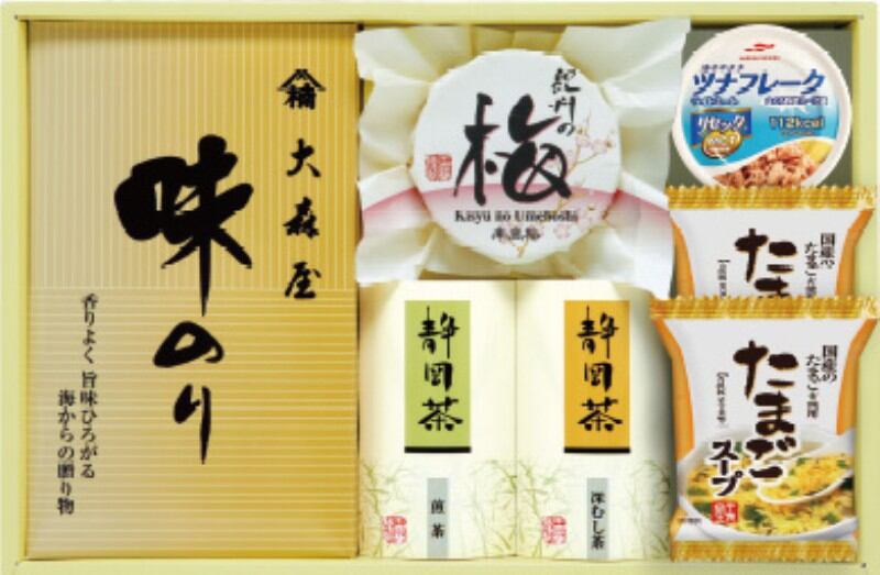 商品内容:大森屋味のり(8切8枚×2)、静岡煎茶40g、静岡深蒸し茶40g、紀州南高梅80g(塩分約8%)、たまごスープ6.4g×2、マルハニチロ 油そのままライトツナリセッタ70g