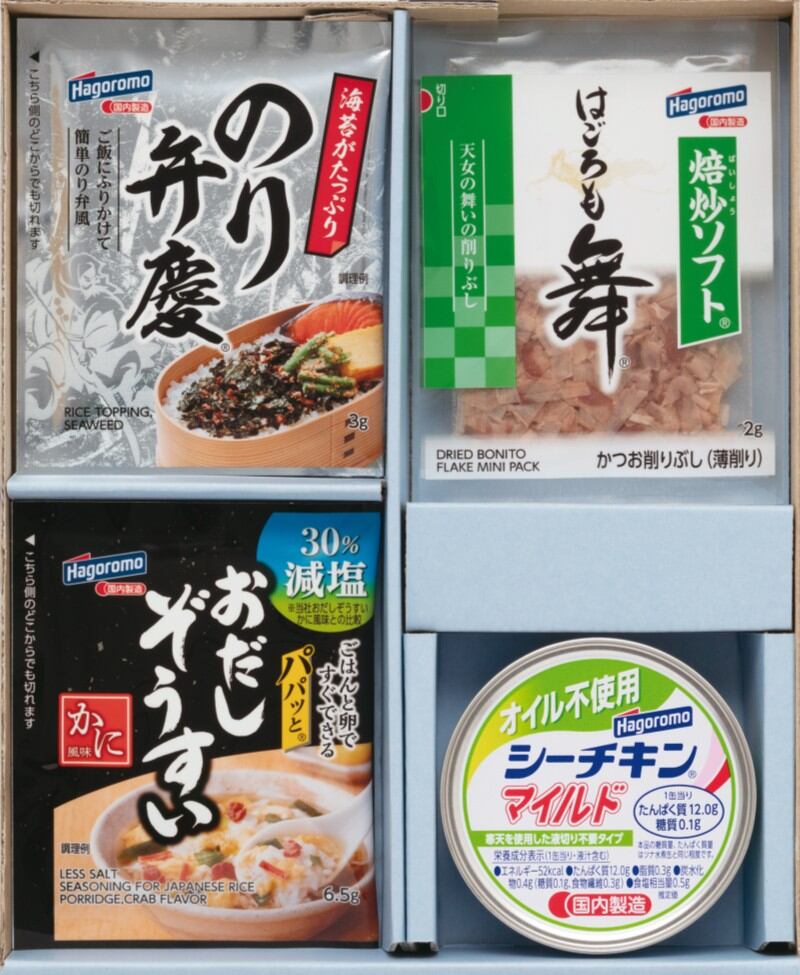 商品内容:のり弁慶ふりかけ3g×2袋、パパッと減塩おだしぞうすい かに風味6.5g×2袋、焙炒ソフトパック はごろも舞2g ×2袋、オイル不使用シーチキンマイルド70g×1缶