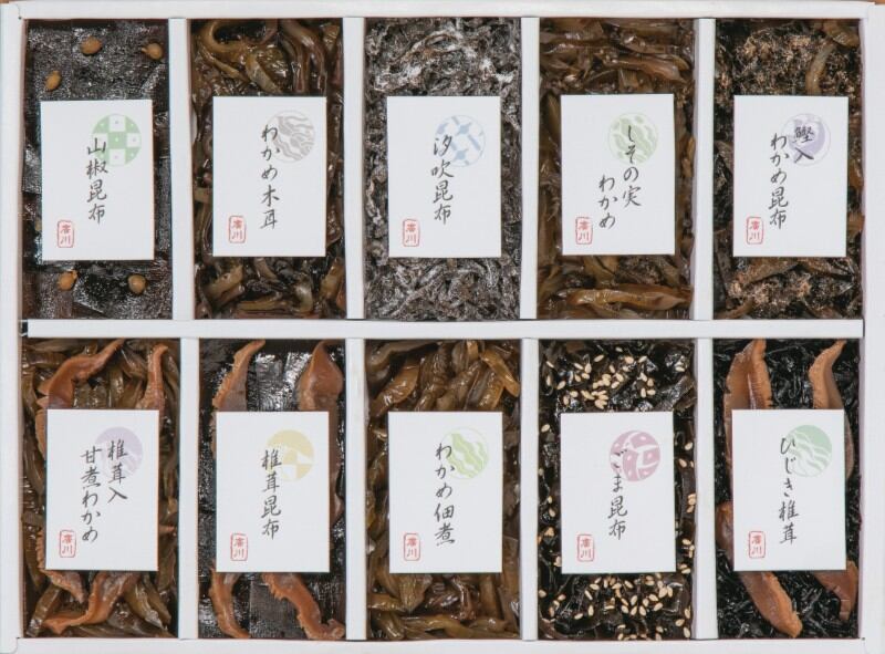 商品内容:ごま昆布45g・椎茸昆布45g・しその実わかめ45g・汐吹昆布20g・山椒昆布45g・ひじき椎茸45g・わかめ佃煮45g・椎茸入甘煮わかめ45g・鰹入わかめ昆布50g・わかめ木耳50g×各1