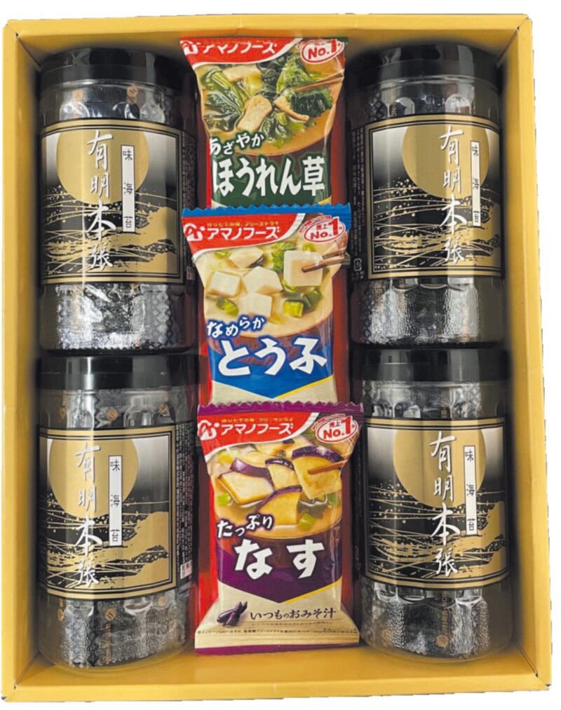 商品内容:味付海苔(12切4枚×9)×4、お味噌汁(なす9.5g・とうふ10g・ほうれん草7g)