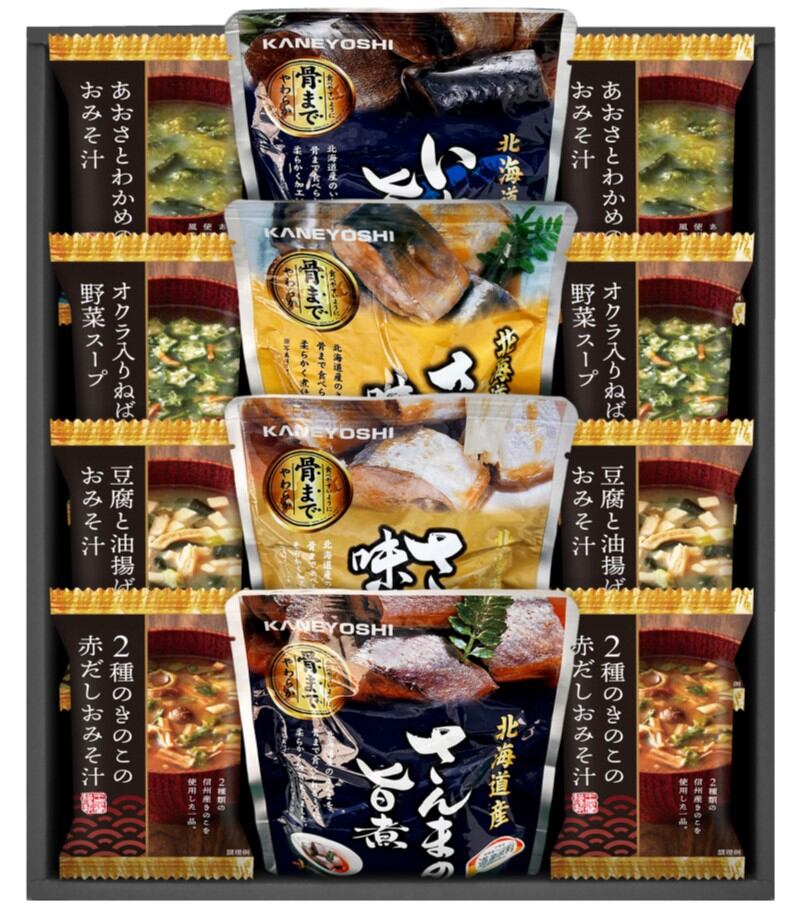 商品内容:とうふと油揚げのおみそ汁、2種のきのこの赤だしおみそ汁、あおさとわかめのおみそ汁、オクラ入ねばねば野菜スープ×各2、北海道産魚の煮付け(いわしの旨煮・さばの味噌煮・さんまの味噌煮・さんまの旨煮)