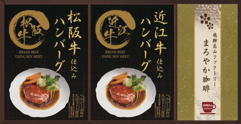 商品内容:松阪牛仕込みハンバーグ大豆ミート入り130g(固形量80g)×1、近江牛仕込みハンバーグ大豆ミート入り130g(固形量80g)×1、飛騨高山ファクトリードリップコーヒー(まろやか)×3