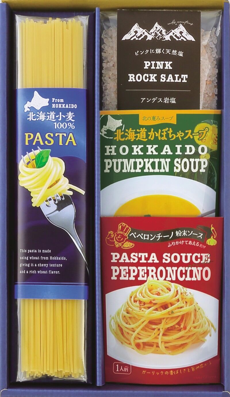 商品内容:北海道小麦のパスタ80g×1、北海道かぼちゃスープ16.5g×1、パスタシーズニング(ペペロンチーノ)3g×1、アンデスのピンク岩塩30g×1