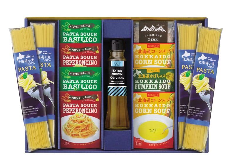 商品内容:北海道小麦のパスタ80g×4、北海道コーンスープ16.5g×2、北海道かぼちゃスープ16.5g×1、パスタシーズニング(ペペロンチーノ)3g×2、パスタシーズニング(バジリコ)3g×2、オリーブ油90g×1