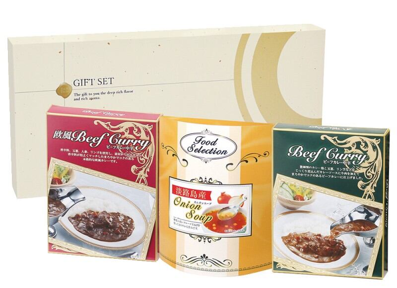 商品内容:ビーフカレーレギュラー(中辛)150g、ビーフカレー欧風(中辛)150g、淡路島産フルーツたまねぎのスープ(6.2g×3)