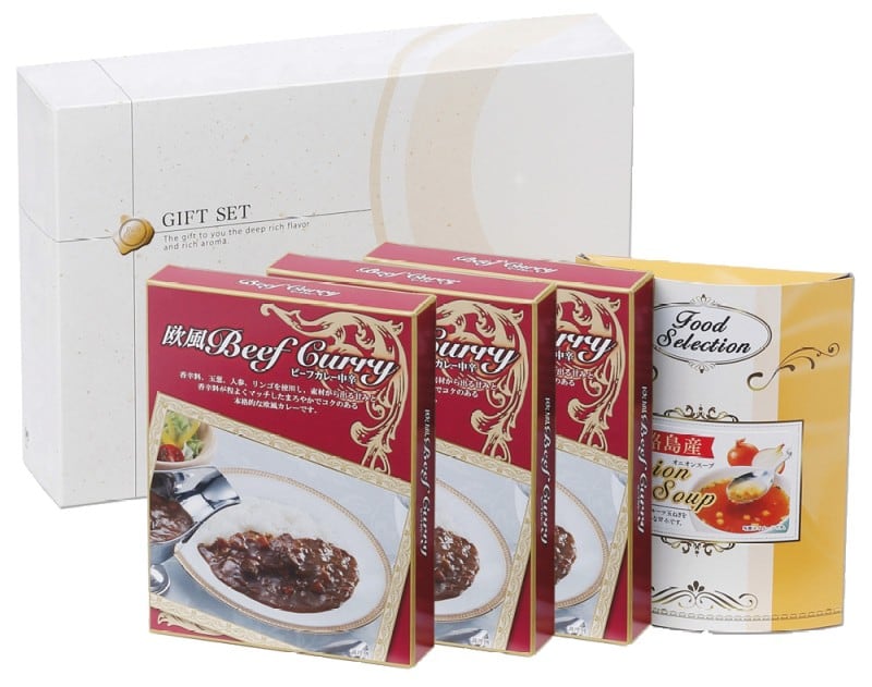 商品内容:ビーフカレー欧風(中辛)150g×3、淡路島産フルーツたまねぎのスープ(6.2g×3)