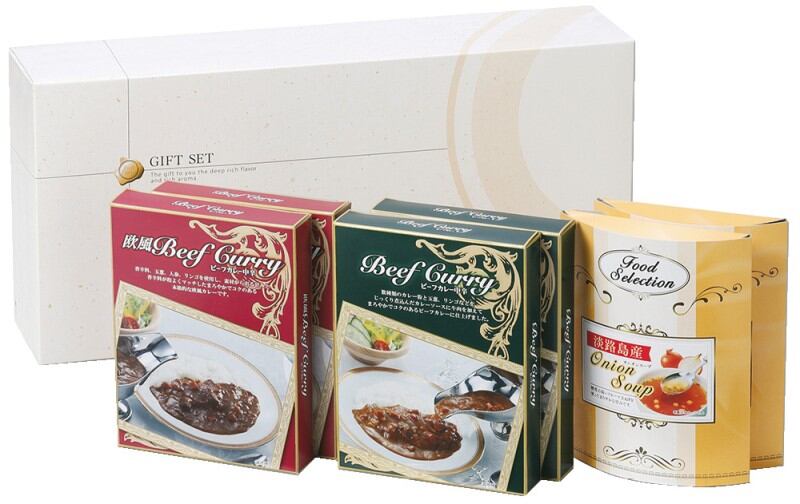 商品内容:ビーフカレーレギュラー(中辛)150g×2、ビーフカレー欧風(中辛)150g×2、淡路島産フルーツたまねぎのスープ(6.2g×3)×2