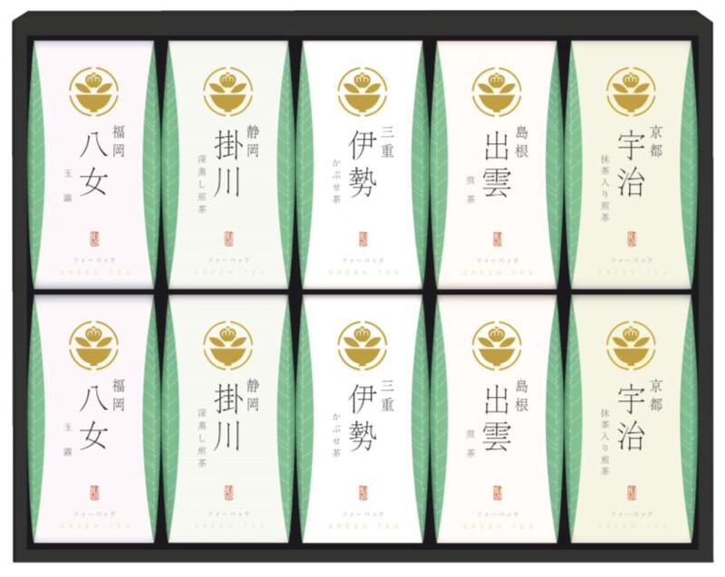 商品内容:福岡 八女玉露ティーバッグ(3g×5p)×2、京都 宇治抹茶入煎茶ティーバッグ(3g×5p)×2、静岡 掛川深蒸し煎茶ティーバッグ(3g×5p)×2、三重 伊勢かぶせ茶ティーバッグ(3g×5p)×2、島根 出雲煎茶ティーバッグ(3g×5p)×2