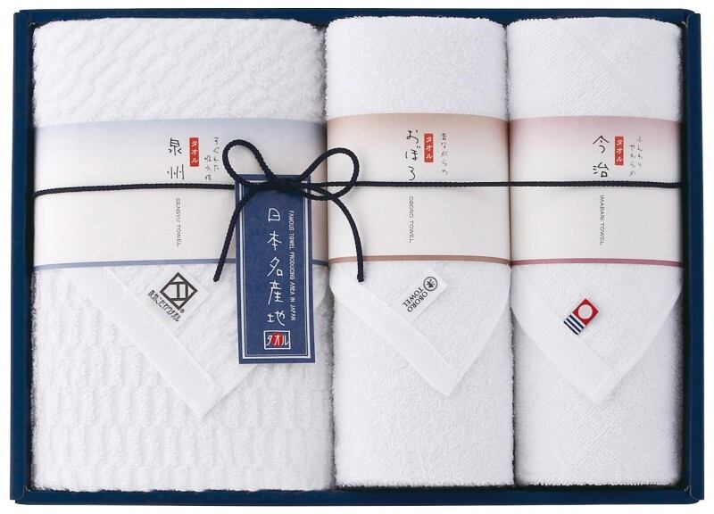 商品内容:バスタオル泉州(60×110cm)×1、フェイスタオル今治(34×75cm)×1、ウォッシュタオル三重(34×35cm)×1