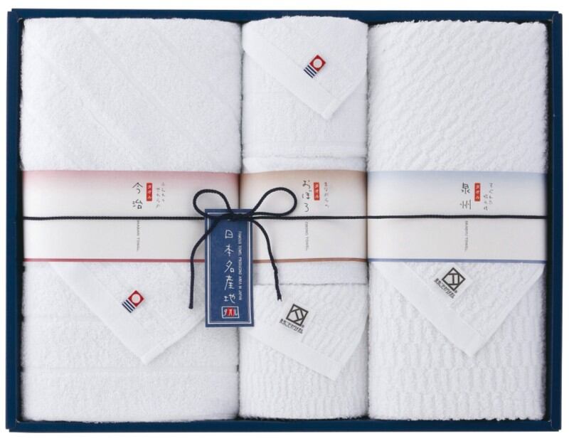 商品内容:バスタオル今治・泉州(60×110cm)×2、フェイスタオル今治・泉州(34×75cm)×2、フェイスタオル三重(34×80cm)×1