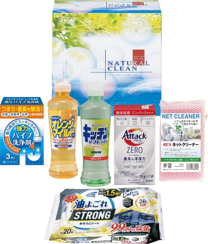 商品内容:花王アタックZEROワンパック(10g×7袋)、キッチンリフレッシュコンパクト270ml、オレンジマイルドコンパクト270ml、パイプ洗浄剤(3包入)、クリンクル油よごれおそうじシート(20枚)、ネットクリーナー×各1