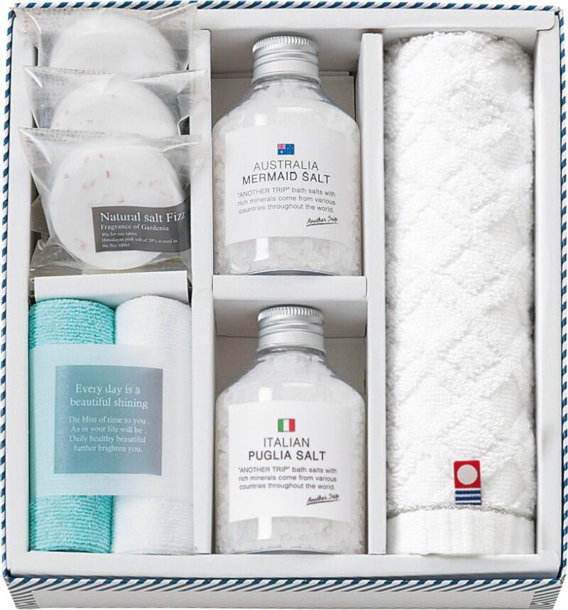 商品内容:バスソルト(イタリアン)海塩(180g)×1、バスソルト(オーストラリア)海塩(175g)×1、ソルト・フィズ(40g)×3、今治ウォッシュタオル(28×30cm)×1、マイクロファイバークロス(25×25cm)×2