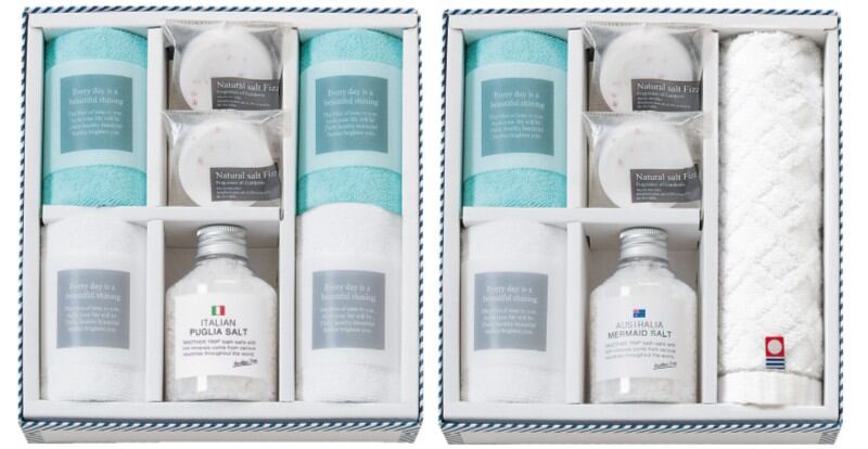 商品内容:バスソルト(イタリアン)海塩(180g)×1、バスソルト(オーストラリア)海塩(175g)×1、ソルト・フィズ(40g)×4、今治ウォッシュタオル(28×30cm)×1、マイクロファイバークロス(25×25cm)×6
