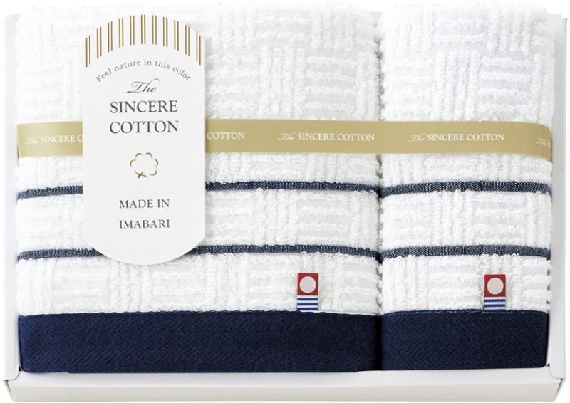 ノーブルな紺色と白色のコントラストが美しい、高級感のあるタオルです。フォーマルでも映えるシックでモダンなデザインが自慢です。