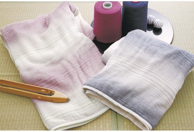 三河木綿の歴史を年輪に見立て、涼しげな柄に仕上げた蒲郡産の三重織ガーゼケットです。洗うほどにふんわり、肌にやさしいガーゼの風合いをお楽しみください。