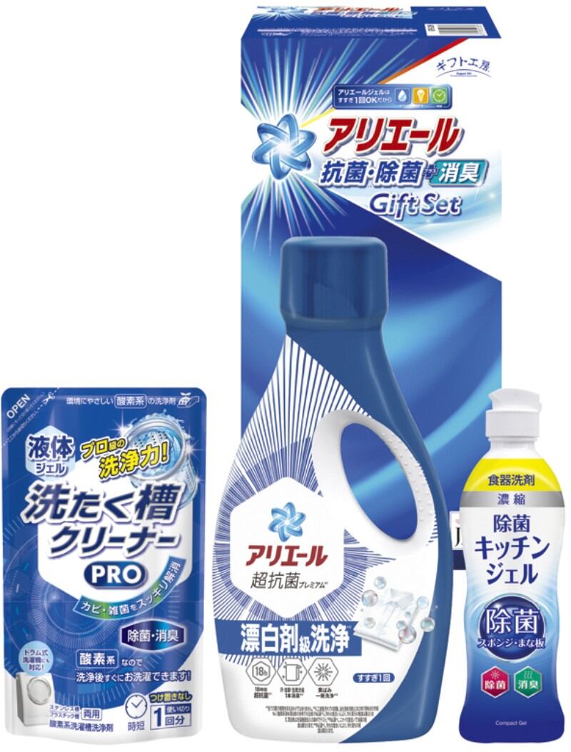 抗菌洗剤アリエールと、少量でたくさん洗える濃縮タイプの食器洗剤除菌ジェル、室内干しのイヤなニオイを防ぎ、ふっくら柔らかく仕上がる抗菌・消臭ソフターなどのギフトです。
