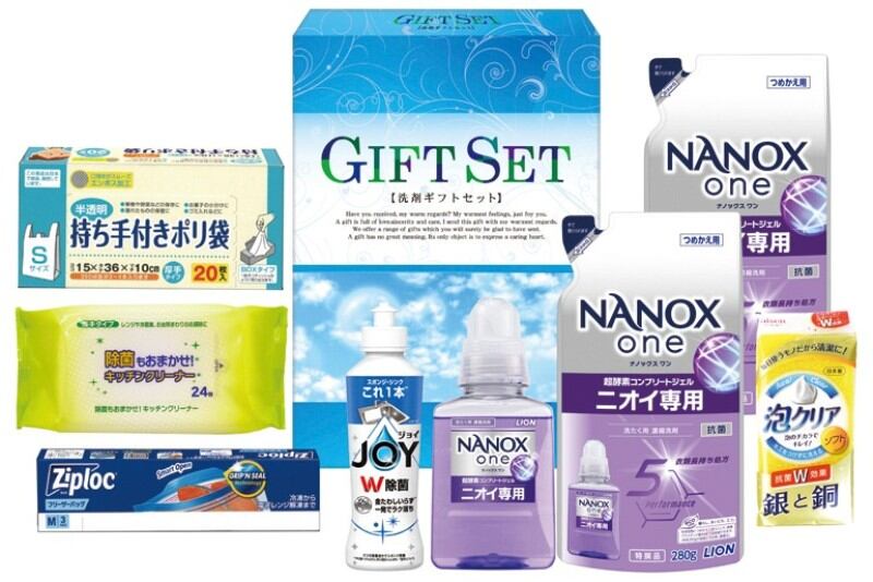 商品内容:ライオンNANOXone380g・P&G除菌ジョイコンパクト170ml・ジップロックフリーザーバッグM3枚・持ち手付きポリ袋S20枚・キッチンクリーナー24枚・泡クリアスポンジ×各1、ライオンNANOXone詰替用280g×2