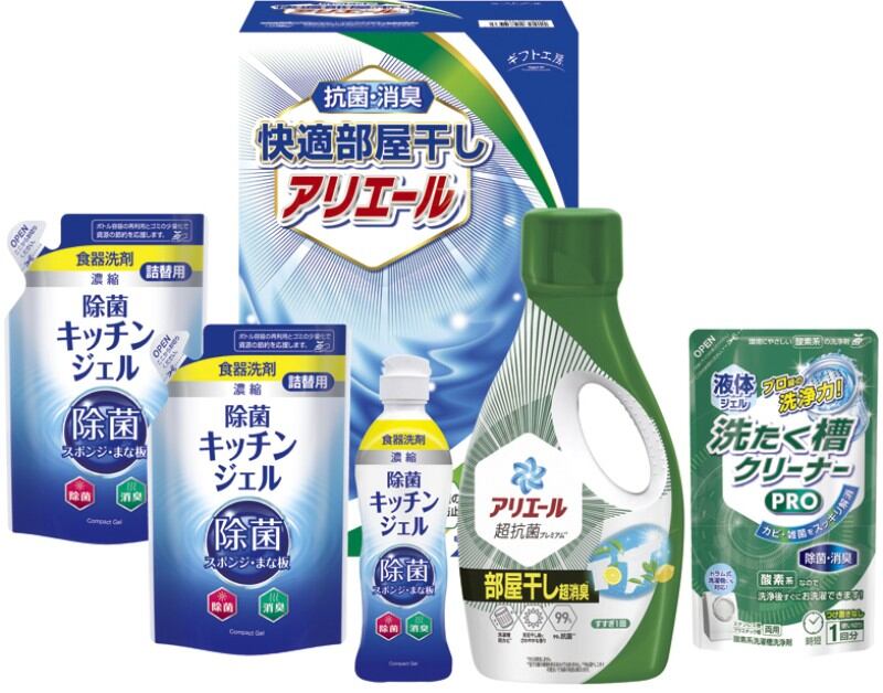 生乾き臭・カビ臭にWで効く部屋干し用のアリエールジェルと本格消臭の抗菌部屋干しソフター、食器洗剤除菌キッチンジェルが入ったクリーンギフトです。