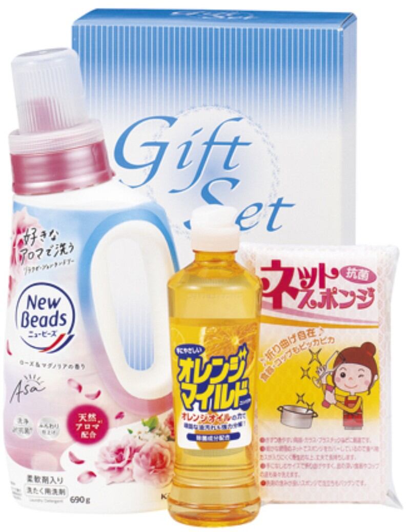 商品内容:花王ニュービーズローズ&マグノリアの香り(本体)690g・オレンジマイルドコンパクト270ml・ネットスポンジ1P×各1