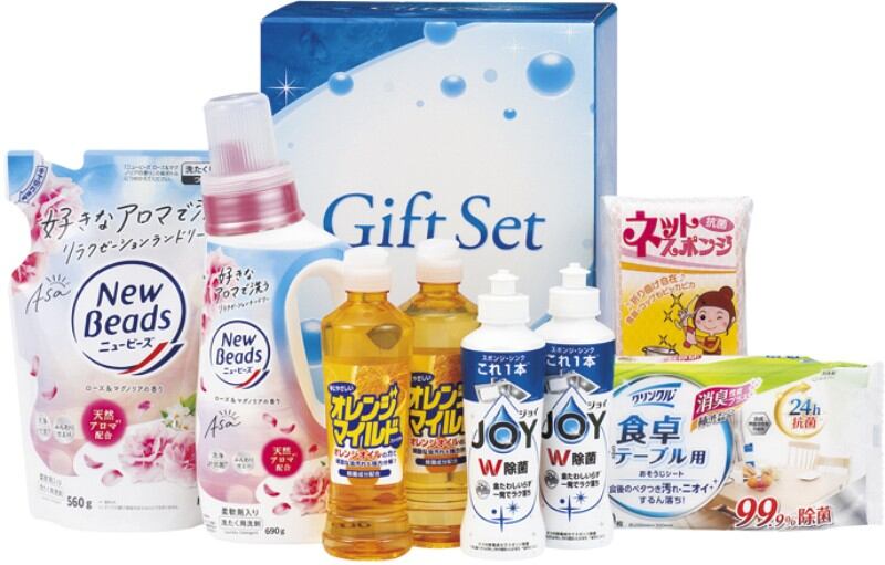 商品内容:P&G除菌ジョイコンパクト170ml・オレンジマイルドコンパクト270ml×各2、花王ニュービーズローズ&マグノリアの香り(本体)690g・花王ニュービーズローズ&マグノリアの香り(詰替用)560g・クリンクル食卓テーブル用シート30枚入・ネットスポンジ1P×各1