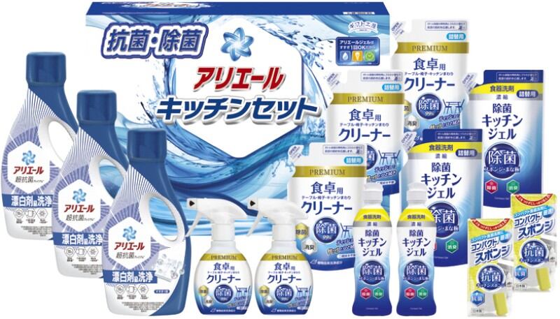 商品内容:P&Gアリエールジェル700g・食卓用クリーナー(詰替)250ml×各3、除菌キッチンジェル200ml・除菌キッチンジェル(詰替)160ml・食卓用クリーナー260ml・コンパクトスポンジ×各2