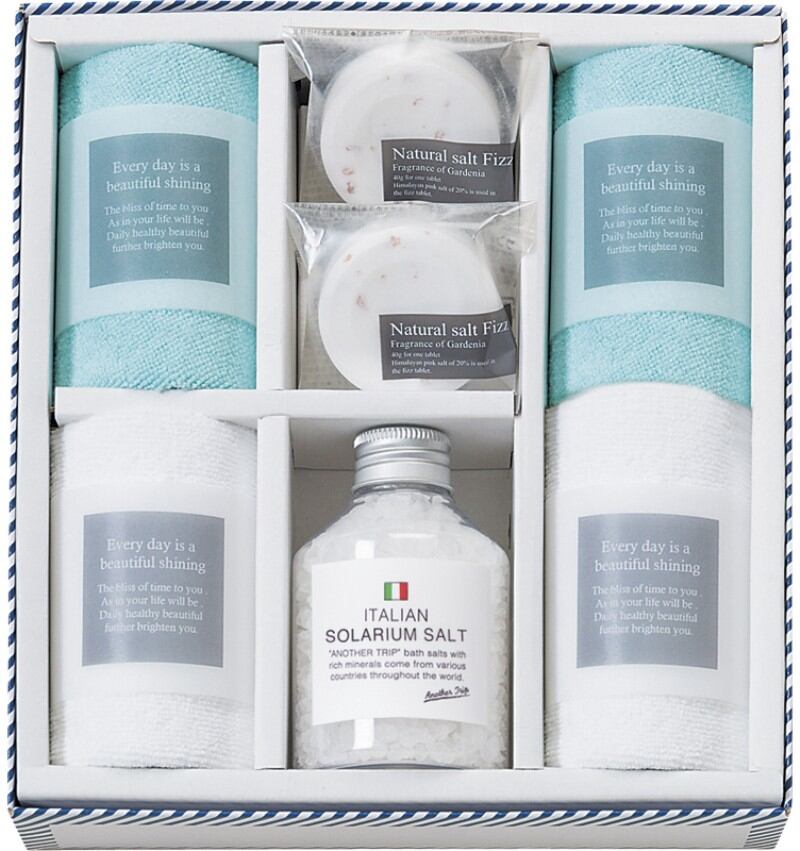 商品内容:バスソルト(イタリア)180g×1、マイクロファイバークロス:25×25㎝×4、ソルト・フィズ40g×2