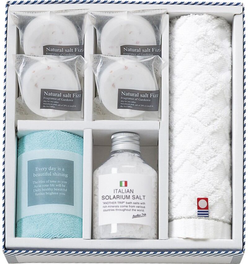 商品内容:バスソルト(イタリア)180g・マイクロファイバークロス:25×25㎝・今治ウォッシュタオル:28×30㎝×各1、ソルト・フィズ40g×4