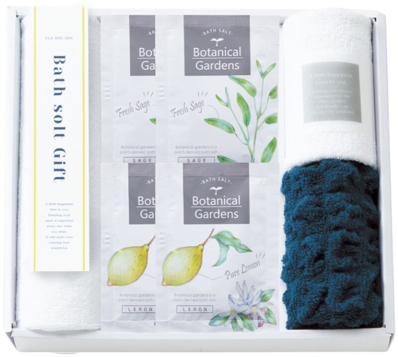 商品内容:ボタニカルガーデンバスソルト(レモン・セージ)25g・マイクロファイバークロス:25×25㎝×各2、ふわもこウォッシュタオル:22×22㎝×1