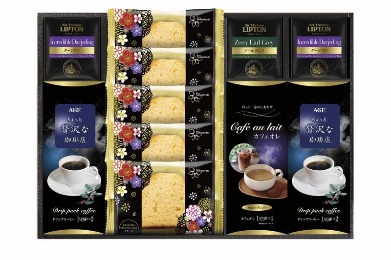 商品内容:AGFちょっと贅沢な珈琲店スペシャルブレンド(7g×2)・サー・トーマス・リプトン アールグレイティーバッグ2.1g×各2、カフェオレ(12g×4)×1、サー・トーマス・リプトン ダージリンティーバッグ2.2g×4、金澤兼六製菓オリジナルケーキ(プレーン)×5