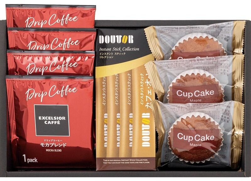 商品内容:エクセルシオールカフェドリップコーヒー(モカブレンド8g)×4、カップケーキ(メープル)×3、ドトールインスタントスティックカフェオレ(9.5g×4本入)×1