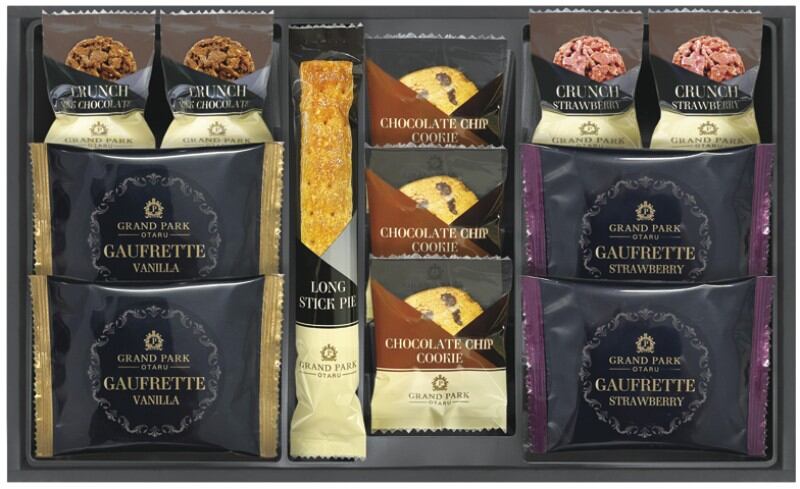 商品内容:ロングスティックパイ×1、ゴーフレット(バニラ・ストロベリー)・チョコクランチ(ミルク・ストロベリー)×各2、チョコチップクッキー×3