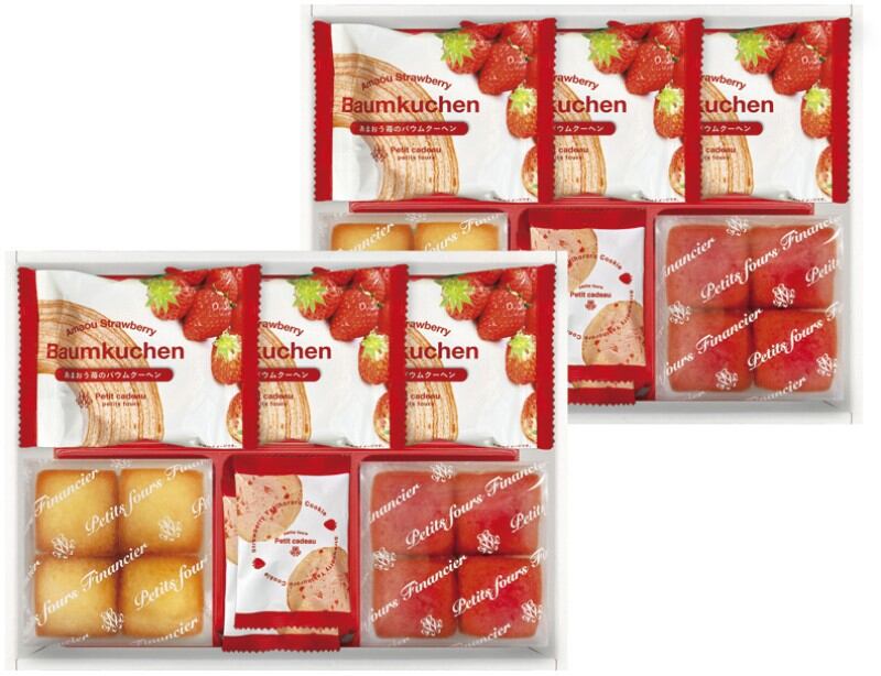 商品内容:あまおう苺バウムクーヘン×6、プチフィナンシェ4個入(あまおう苺・プレーン)×各2、焼きほろろクッキー(イチゴ)×4