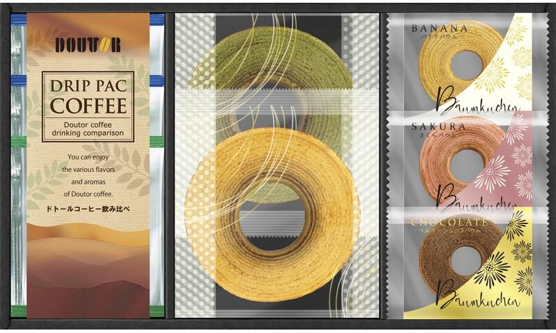 商品内容:ミルクバウムクーヘン・宇治抹茶バウムクーヘン・ドトールドリップコーヒー(キリマンジャロブレンド7g)・ミニバウムクーヘン(バナナ・桜・ベルギーショコラ)×各1、ドトールドリップコーヒー(深煎りブレンド7g)×2