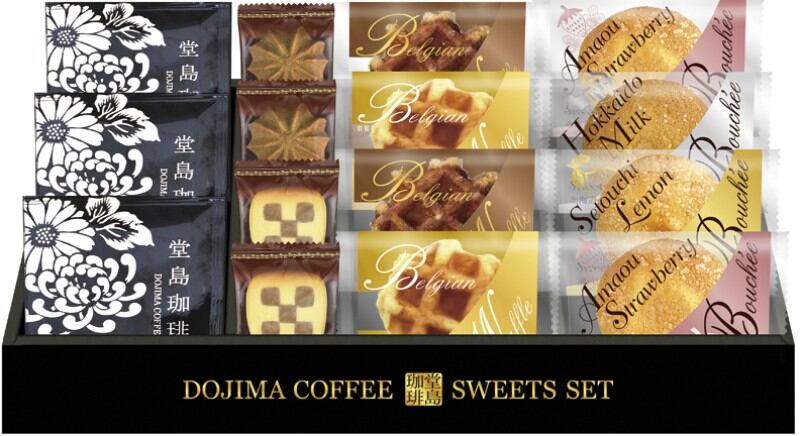商品内容:堂島珈琲ドリップコーヒー8g×3、あまおう苺ブッセ・ベルギーワッフル(プレーン・ショコラ)・クッキー(コーヒー・チェス)×各2、ブッセ(瀬戸内レモン・北海道ミルク)×各1