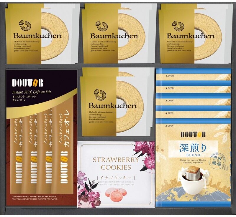 商品内容:バウムクーヘン×8、ドトールカフェ・オ・レ9.5g×4、ドトールドリップコーヒー深煎りブレンド7g×5、イチゴクッキー30g×1