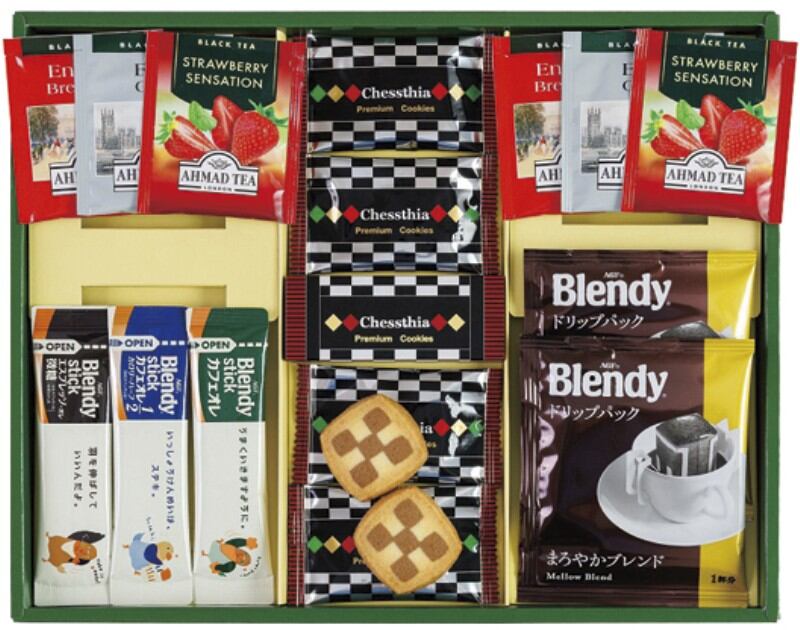 商品内容:チェスティアクッキー×4、AGFブレンディコーヒードリップ式7g・紅茶(アールグレイ・イングリッシュブレックファースト・ストロベリー)2g×各2、AGFブレンディスティック(エスプレッソ・オレ5.8g・カフェオレカロリーハーフ5.4g・カフェオレ8.2g)×各1