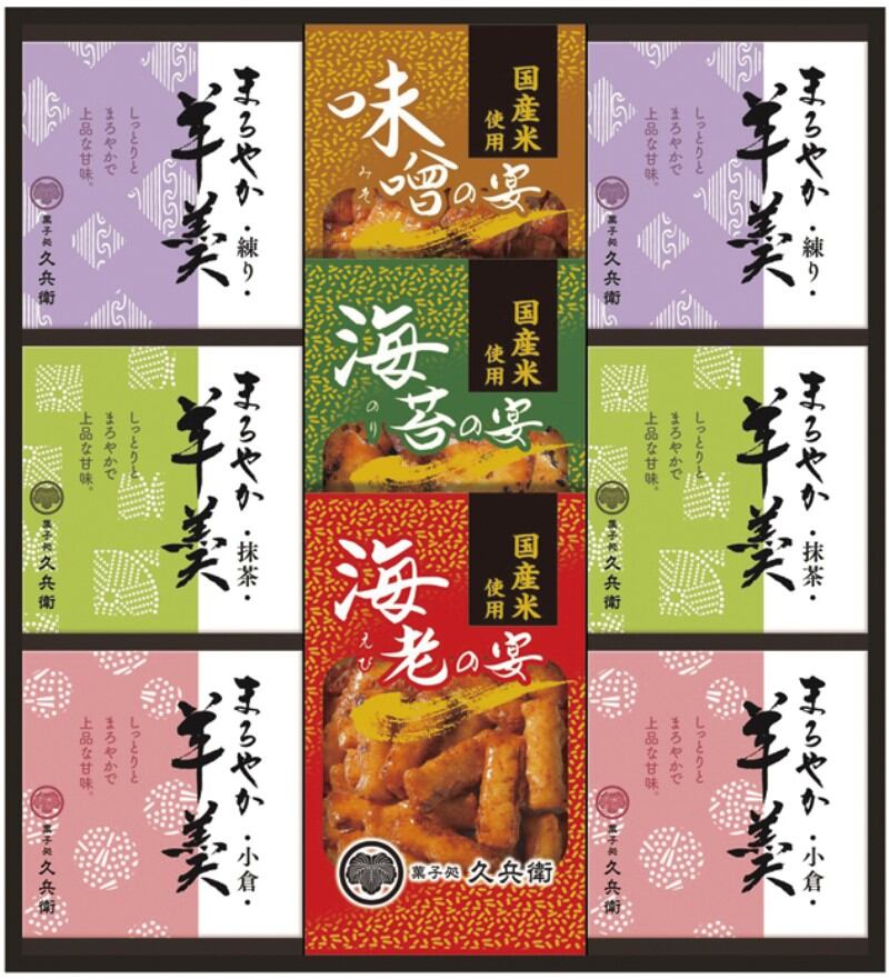 商品内容:あられ(海老・海苔・味噌)12g×各1、羊かん(抹茶・練り・小倉)60g×各2