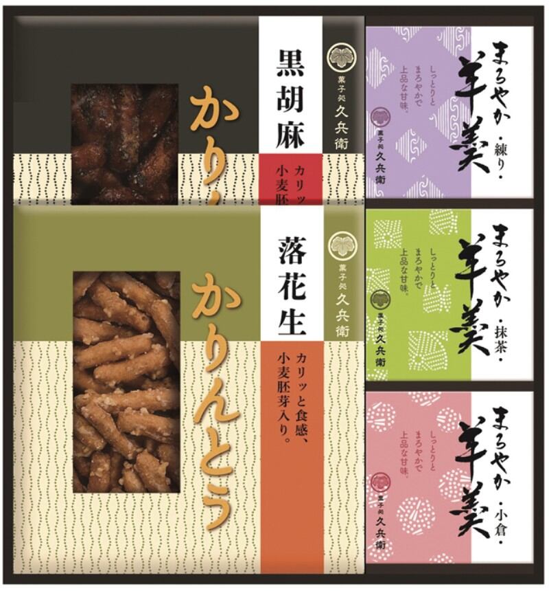 昔ながらの素朴な味のかりんとう、夏でも冬でも楽しめるまろやか羊かん、国産米だけで作ったあられなどを詰合せました。