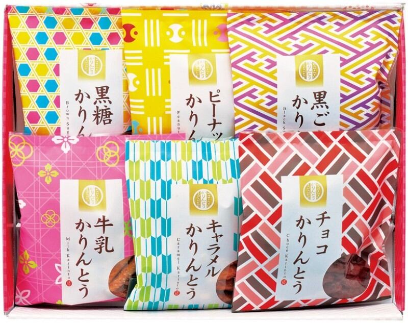 商品内容:かりんとう(黒ごま・黒糖・牛乳・ピーナッツ・チョコ・キャラメル)45g×各1